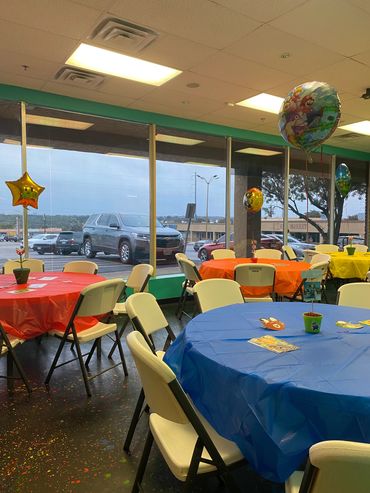 By the front window, it has 6 round tables with 40 chairs, and two rectangular tables for cake and presents.