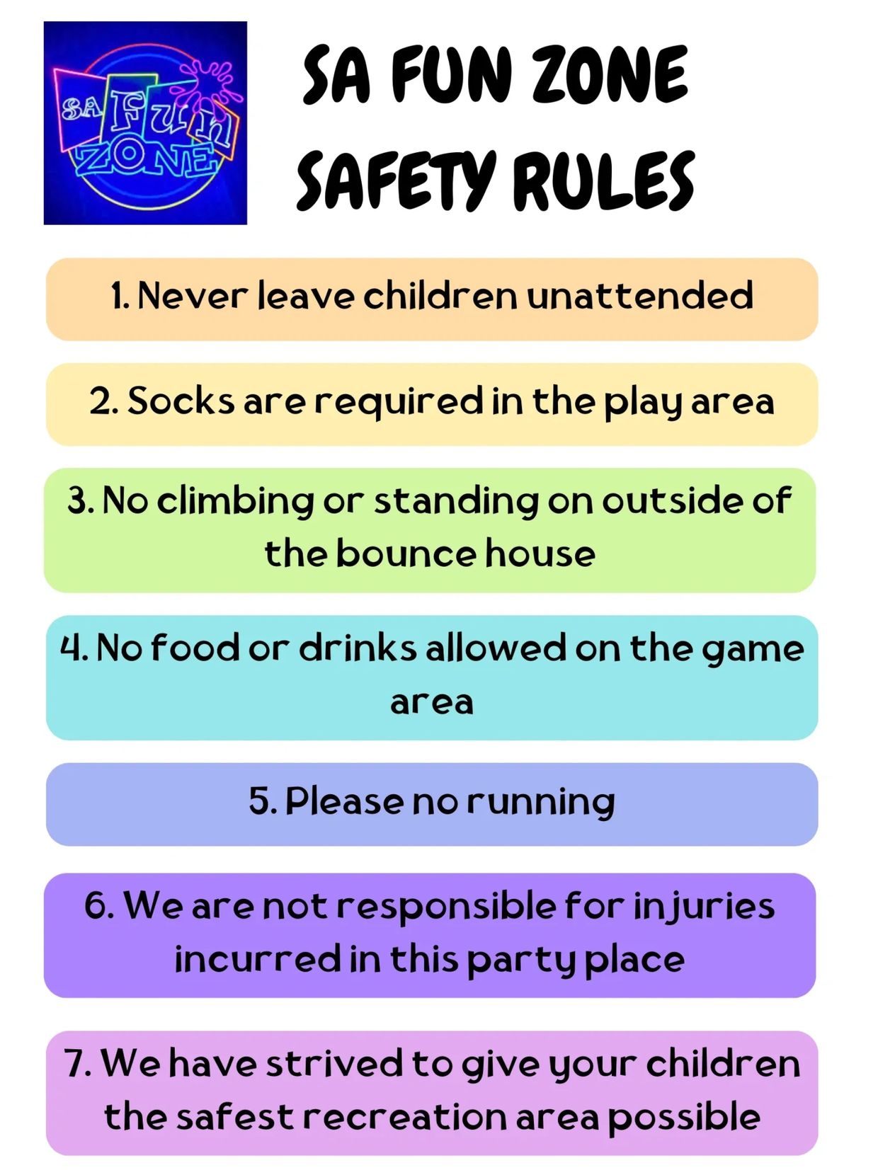 ROOM CONDITIONS Renter is responsible for returning SA FUN ZONE room(s) (entrance and playroom) to their original conditions. NO FOOD OR DRINKS ALLOWED IN PLAY AREA. Shoes must be removed while in the bounce house. Please make sure kids are wearing shoes while playing in the play area. Tables must be covered with table covers.